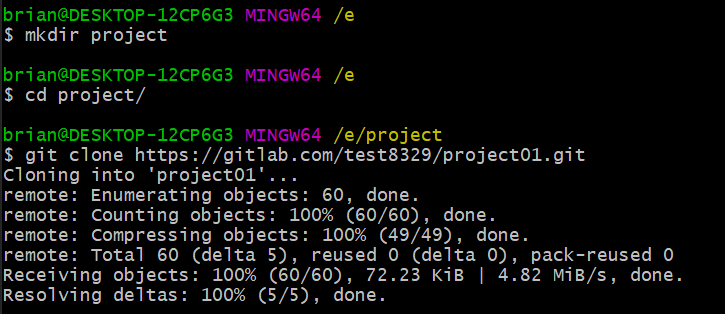 2. 내려받을 폴더를 만들어서 git clone (복사한 주소) 를 입력한다.
